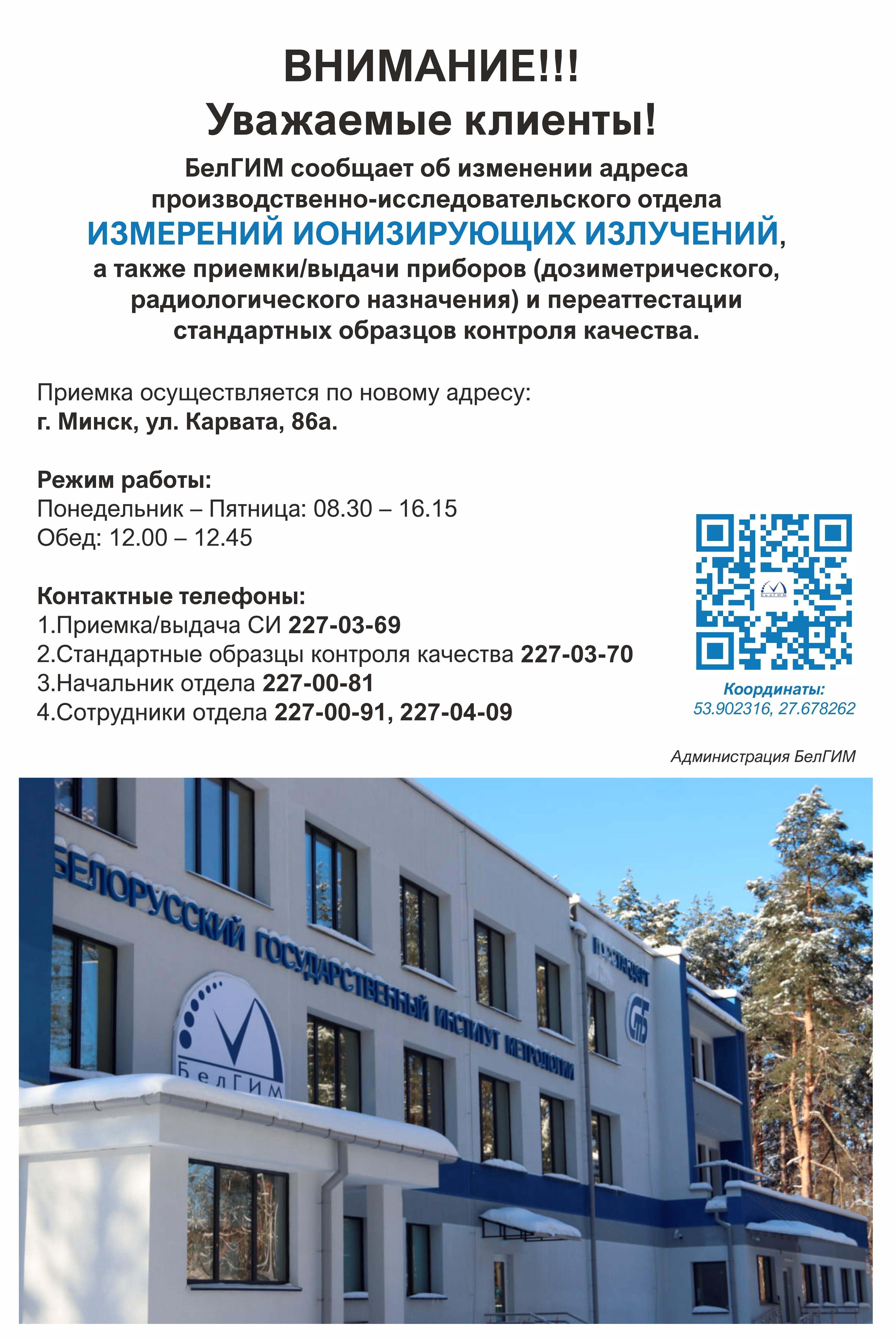БелГИМ сообщает об изменении адреса производственно-исследовательского отдела ИЗМЕРЕНИЙ ИОНИЗИРУЮЩИХ ИЗЛУЧЕНИЙ, а также приемки/выдачи приборов (дозиметрического, радиологического назначения) и переаттестации стандартных образцов контроля качества.
